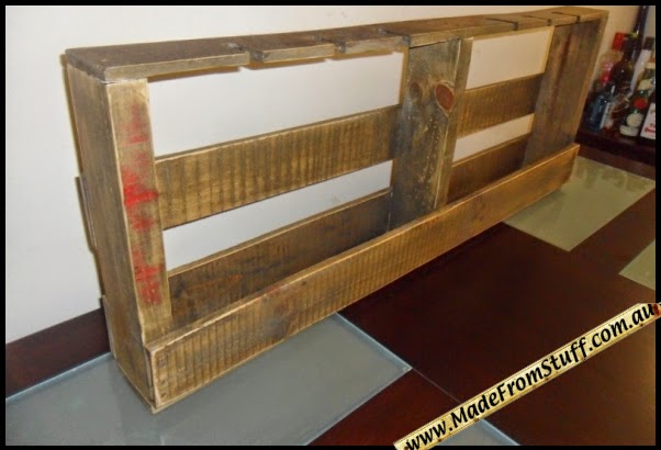 We call this one the "compact wine rack" as the glasses hang between the bottles. It has been made from a recycled pallet, has been sanded, stained, distressed and then finished with clear polyurethane for a durable and long lasting finish.